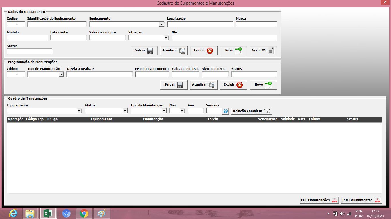 Se você chegou até aqui, é porque está perdido com papéis ou quer simplesmente mais agilidade no controle das suas manutenções, e esta planilha é justamente o que você está procurando, a solução de todos os problemas desse controle com o melhor custo benefício que você vai encontrar na internet, um verdadeiro sistema desenvolvido 100% em Excel com programação VBA e capacidade para 50mil registros em cada botão. Ou seja, Você terá um sistema de manutenções com um custo baixíssimo. Confere agora o que essa planilha vai lhe proporcionar: