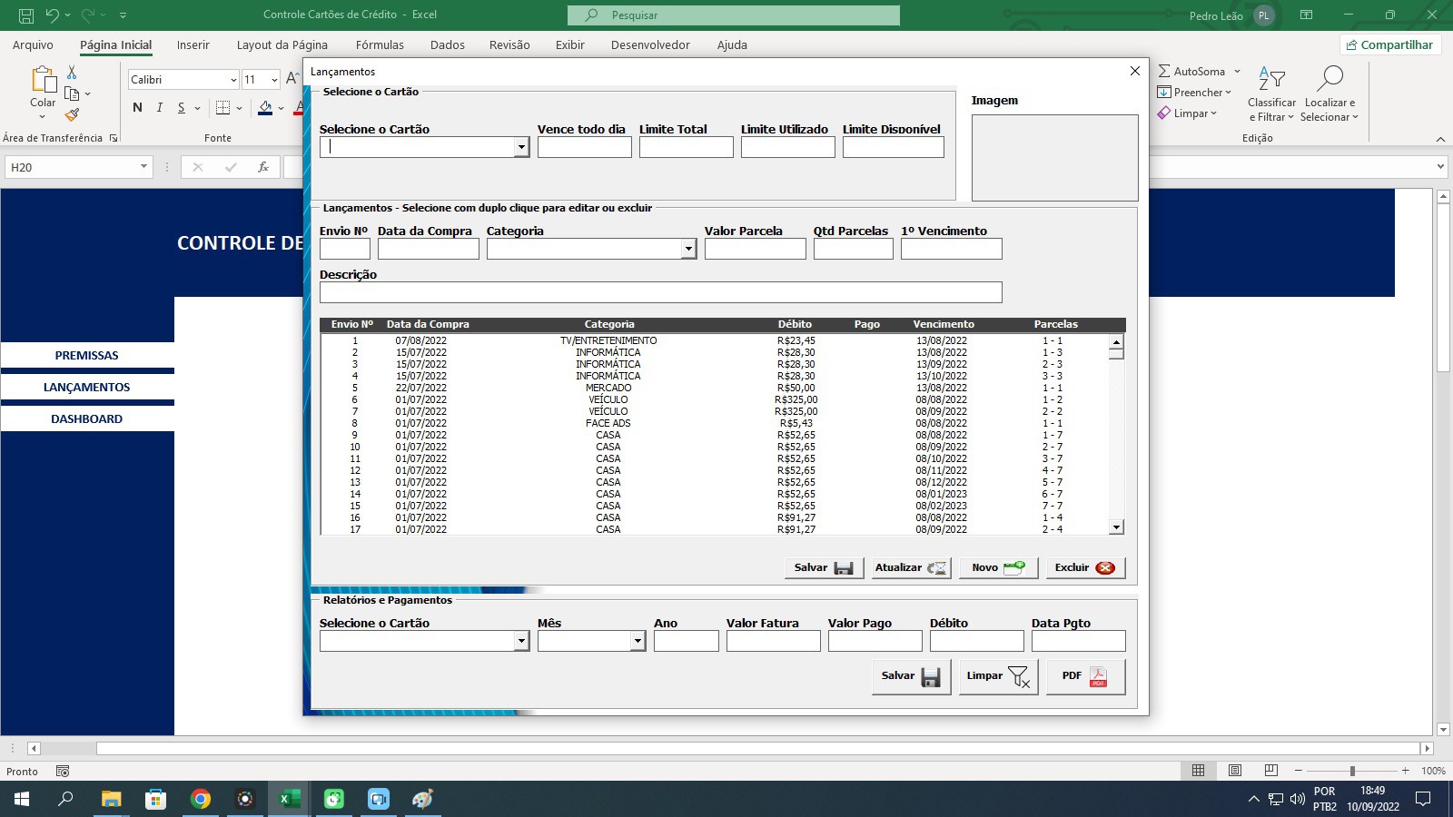 Dashboard gerencial que lhe dará uma visão histórica, atual e prevista de todos os seus gastos, podendo inclusive, segmentar por cartão.