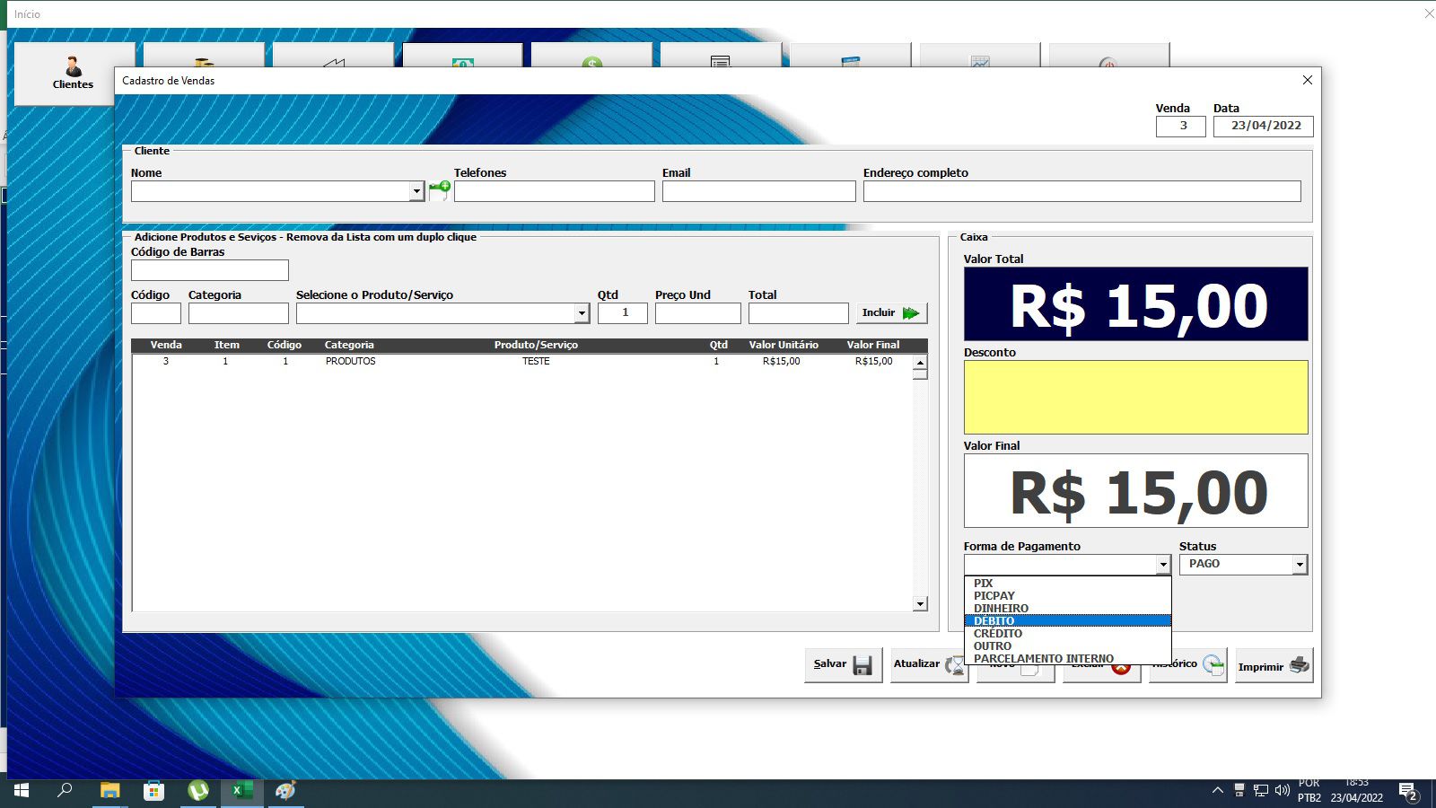 CADASTRO DE VENDAS: Cadastre suas vendas com auxilio de um leitor de código de barras (Não incluso, você precisa possuir um leitor) e agilize o seu dia. Atribua descontos e controle parcelamentos internos do seu negócio