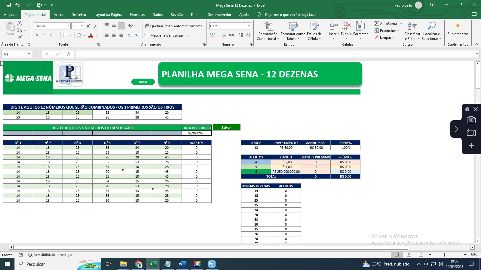 Planilha Desdobramento Mega Sena - 12 Dezenas em 12 Jogos